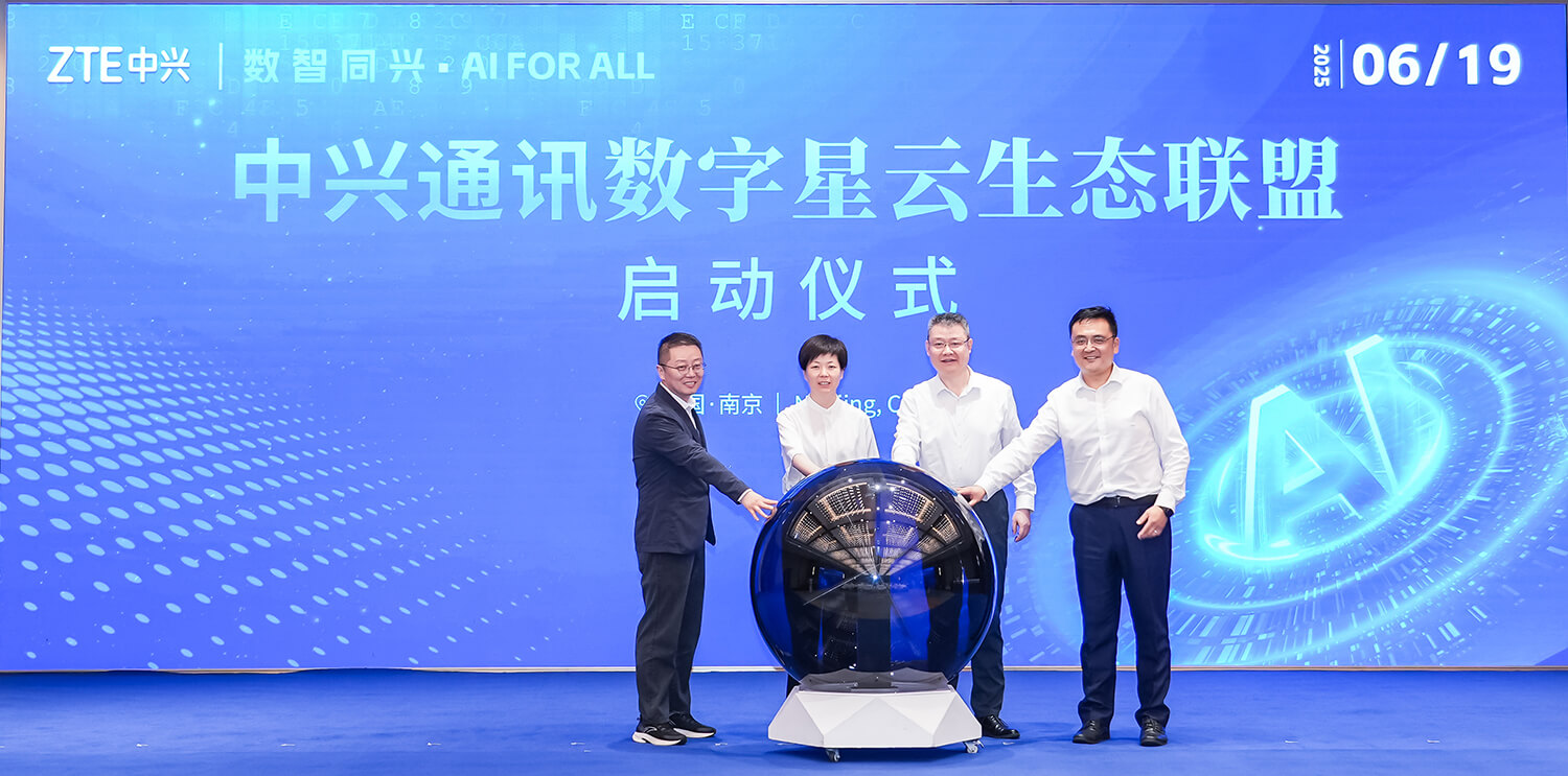 南京市副市长蒋敏(左二)亲临大会现场,与中兴通讯高级副总裁王翔(右二)等人共同启动中兴通讯数字星云生态联盟,该联盟旨在整合各方资源,通过标准化协作机制推动技术成果转化,为南京乃至全国数字经济产业发展注入新动能。